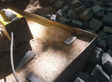 Засыпаем пескобетонную смесь, укладываем брусчатку.