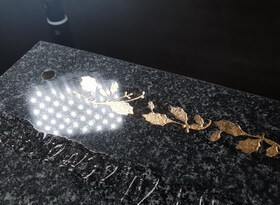 Саму гравировку мы выполнили при помощи пескоструйного аппарата и сразу же принялись за покрытие текста сусальным золотом. Начали с орнамента, так как работать с элементами декора проще, чем с печатным текстом.